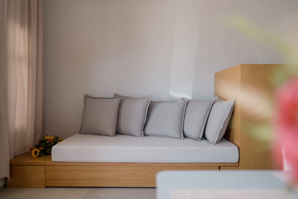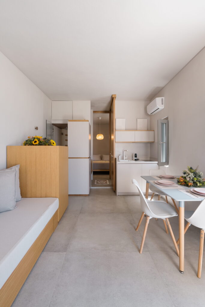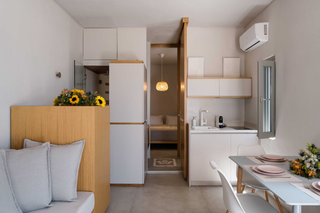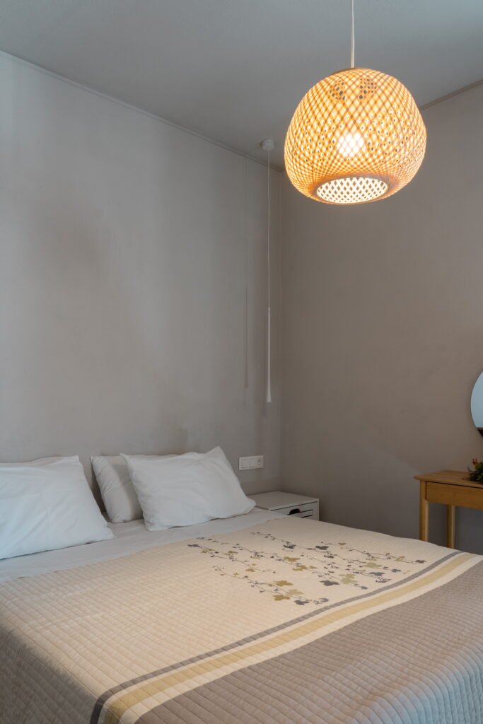 Zefiros Apartment has a separated bedroom with a double bed. It comes with a fully equipped kitchen, living room with a double sofa bed, bathroom, etc.