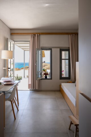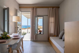 With an amazing panoramic view of the Aegean and Mikri Vigla, the studio has one double and one single bed. It has a large veranda.